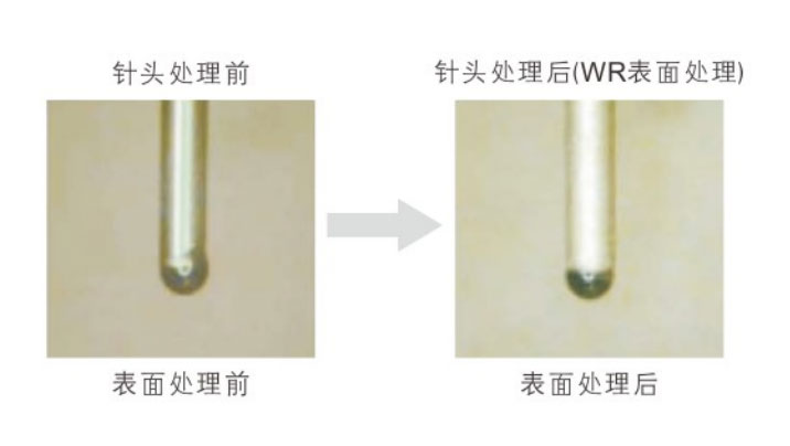 精準點膠的秘訣在于抑制出膠量不均,材料拉絲,前 端爬膠等現象,進一步實現高品質的點膠。 在點膠針頭前端及內徑進行特殊材料的表面處理,可 以實現更精準的點膠。請依照使用目的與用途來選擇 表面處理的種類。