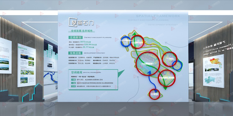 石門縣宛如一顆綠色的寶石鑲嵌在湖南北部,東南毗連八百里洞庭湖,西接武陵山脈,和國家森林公園張家界為鄰,雄居縣境北部的壺瓶山與湖北神農架互為依托,享有“武陵門戶”與“瀟湘北極”之稱的美譽。我司以印象石門、擘畫石門、筑夢石門為三大主題,通過規劃展示廳這一窗口,讓訪客了解發現石門萬象。展示廳貫穿石門的山、水、城、文等宜游宜居城市特質元素,浸透著“澧濱晨曦,山水石門”的氣質。