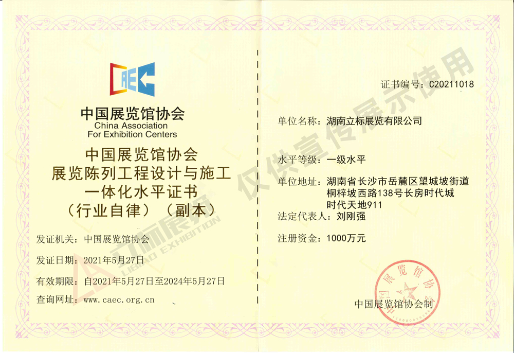 近日,湖南立標展覽有限公司通過了中國展覽館協會的資質等級評定,榮獲“中國展覽館協會展覽陳列工程設計與施工一體化水平證書”,水平等級為一級水平,并獲得由中國展覽館協會頒發的資質證書。此次一級水平證書的獲得標志著我司在展覽陳列水平等級方面又上了一個新的臺階,也說明我司在展覽展示空間藝術領域的作品得到了行業認可。