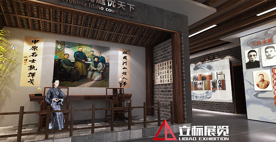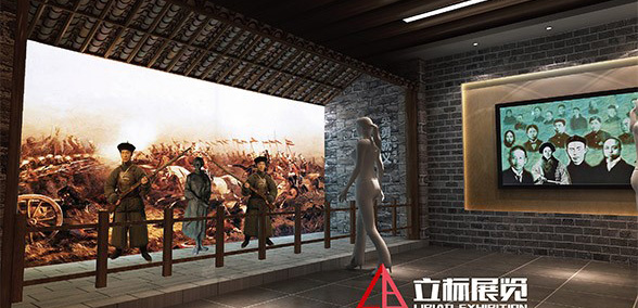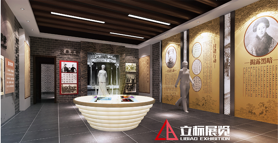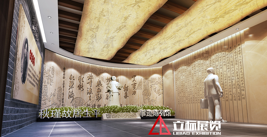 在展館的室內設計中采用曲線、波浪、墻、弧形等流動的元素。在色彩色上以黑、白、灰為主基調,借助展板,燈箱,造型,場景復原,浮雕雕塑與聲、光、電等現代的科技手法,并以動與靜、虛與實、冷與暖的藝術手段建立起展品與內容間的內在聯系,起到升華的主題,增強藝術感染力的作用,從不同方面展示秋瑾的一生。