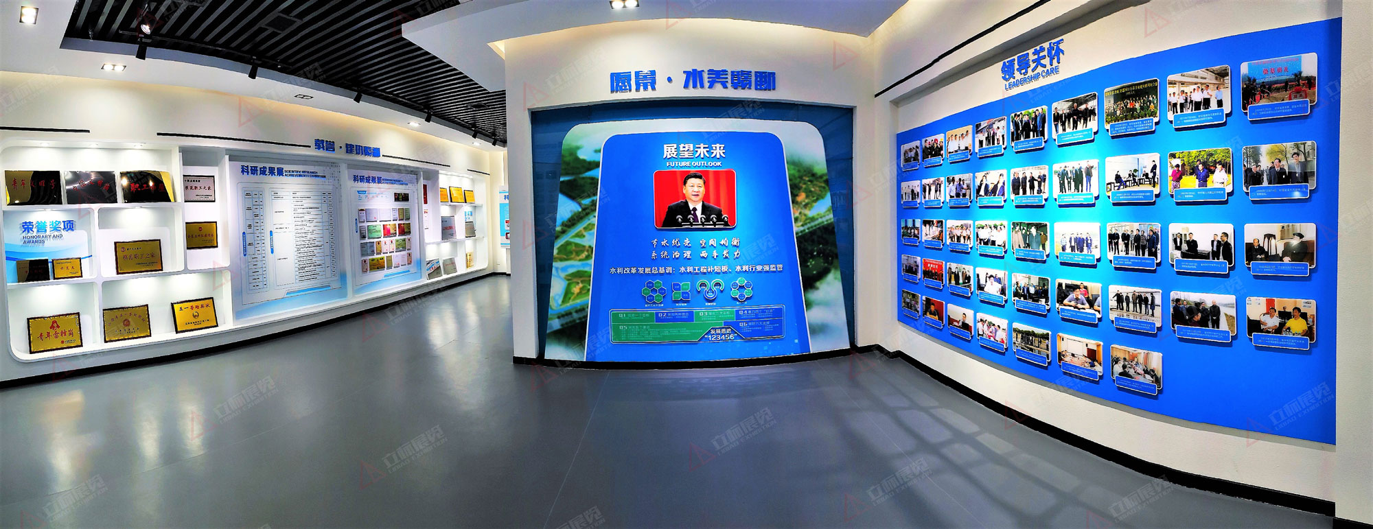 展館突出“水”元素,強(qiáng)化“水”主題,展現(xiàn)“水”文化特色,設(shè)計(jì)元素契合水科院文化特色綜合運(yùn)用聲光電,結(jié)合投影、場(chǎng)景裝置以及互動(dòng)裝置等,展示形式多樣化豐富天花、地面、界面的色調(diào)、造型表現(xiàn),各個(gè)版塊空間的調(diào)性有所區(qū)分,使小空間的主題演繹異彩紛呈,使觀展節(jié)奏更加張弛有度。
